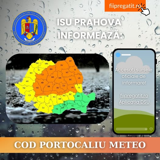 În cazul apariției unei situații de urgență, apelați 112 imediat. Pentru actualizări meteo, consultați www.meteoromania.ro. Ghiduri utile de comportament în caz de pericol sunt disponibile pe fiipregatit.ro și în aplicația DSU.