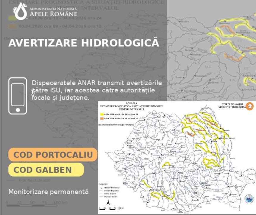 În perioada 3 aprilie, ora 09:00 – 4 aprilie, ora 12:00, hidrologii avertizează asupra unor viituri importante, cu risc de depășire a cotelor de inundație, pe râuri din bazinele Siret, Moldova, Bistrița și Miletin. Efectele pot fi semnificative la nivel local, în special în zonele joase și în apropierea cursurilor de apă.