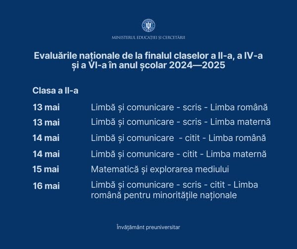 Ministerul Educației anunță că, începând de mâine, 13 mai 2025, va demara administrarea evaluărilor naționale pentru elevii claselor a II-a, a IV-a și a VI-a, aferente anului școlar 2024-2025.