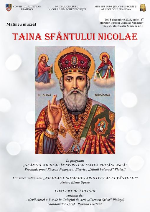 Joi, 5 decembrie 2024, începând cu ora 14:00, Muzeul Ceasului „Nicolae Simache” din Ploiești (str. Nicolae Simache nr. 1), parte a Muzeului Județean de Istorie și Arheologie Prahova, organizează evenimentul cultural „Taina Sfântului Nicolae”