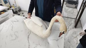 Comisarii Gărzii de Mediu Botoșani au intervenit rapid și au transportat lebăda la cabinetul veterinar Trio.vet, unde a fost plasată sub îngrijire provizorie. Evaluarea medicală a scos la iveală un traumatism esofagian sever, însoțit de hemoragie masivă, precum și o stare avansată de slăbiciune cauzată de malnutriție (casexie).